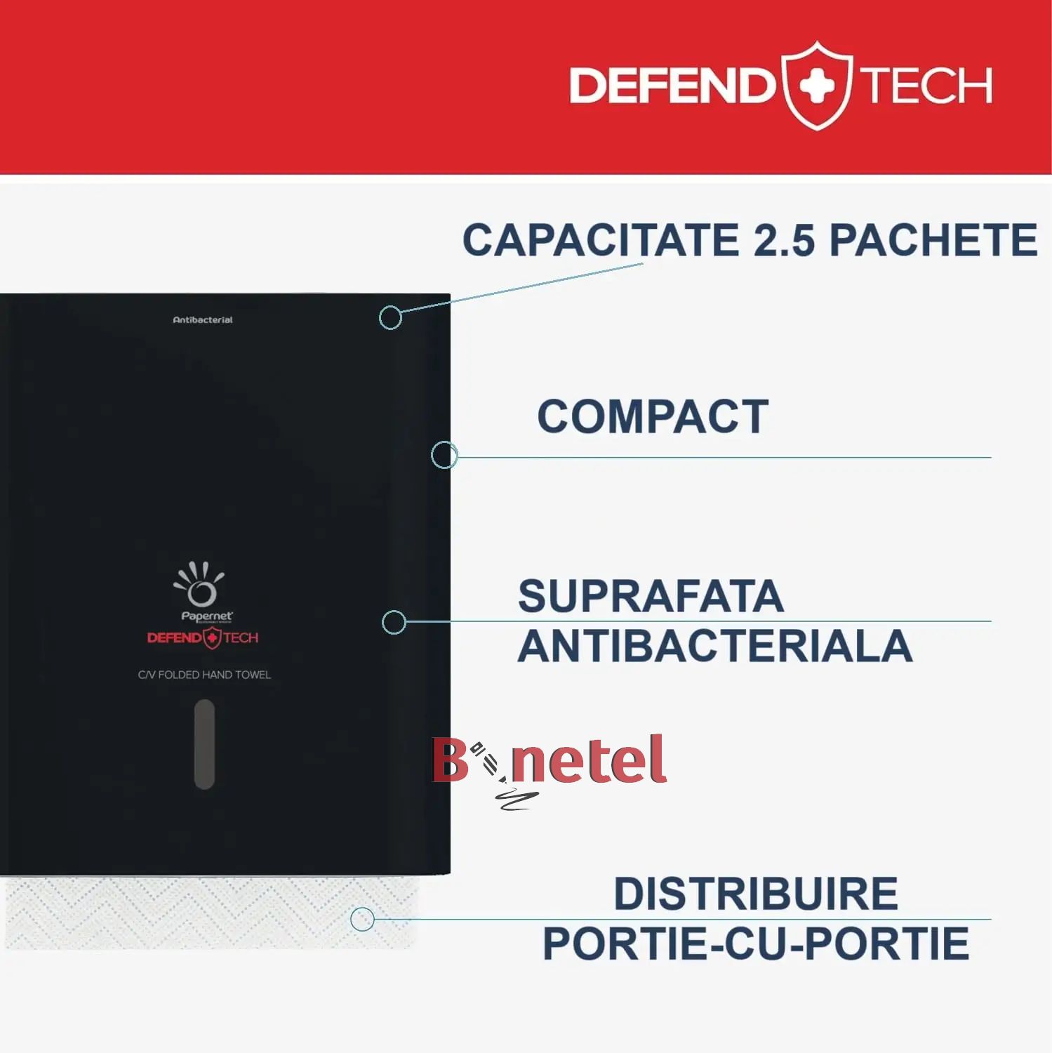 DEFEND TECH tehnologija : Površina dozatora tretirana je jonima srebra koji deluju antimikrobno i sprečavaju umnožavanje i širenje bakterija na celokupnoj svojoj površini.