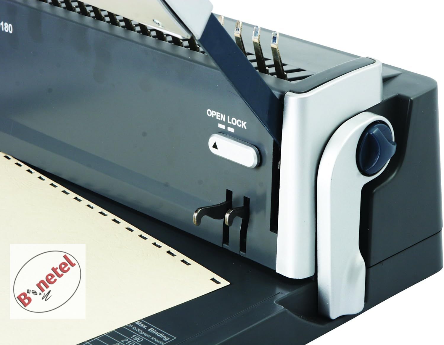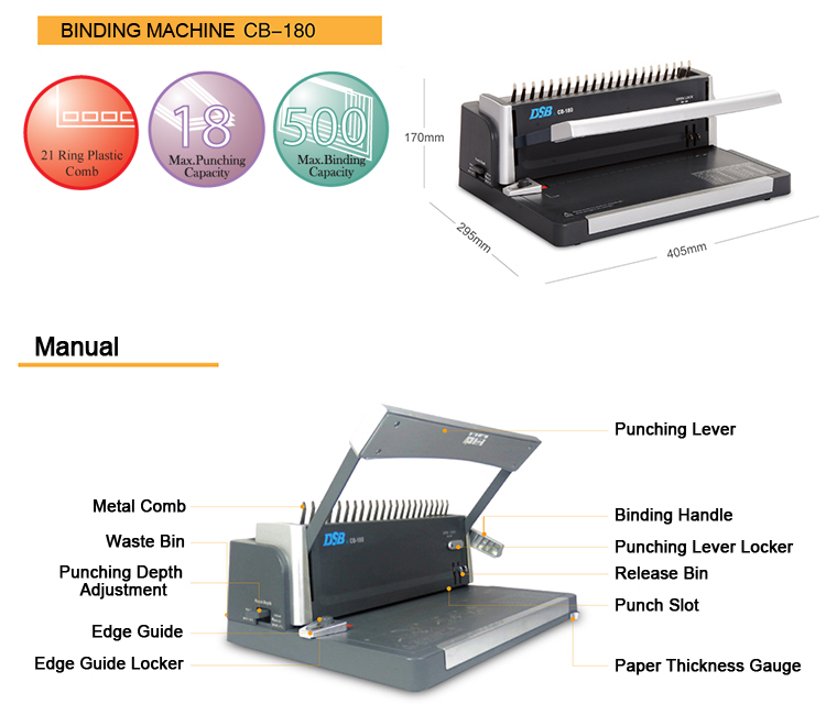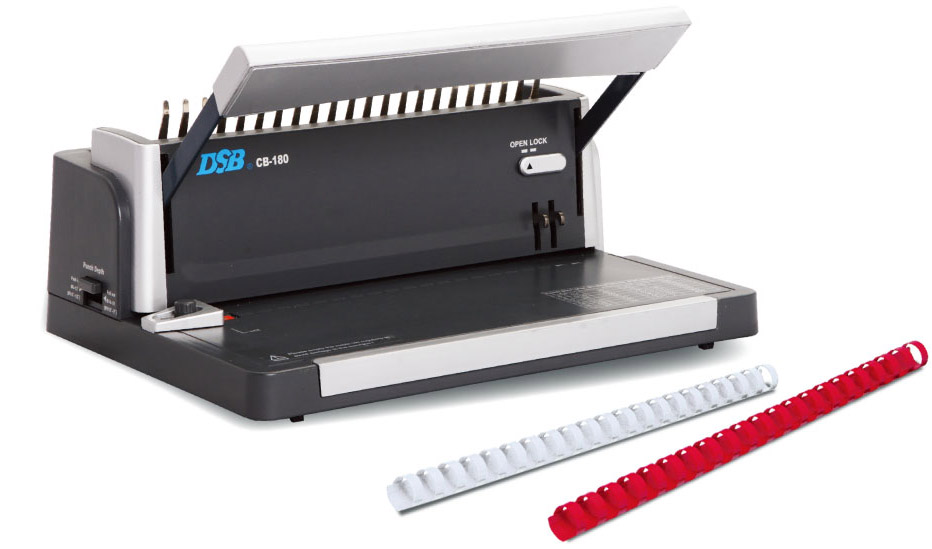 Model CB-180 ima široku osnovu što obezbedjuje povećanu stabilnost prilikom rada. Kapacitet koričenja je do 500 listova i bušenjem do 18 listova u jednom koraku. Ima poseban taster za zaključavanje tzv "Lock Button" što ga činim savršenim za uštedu prostora za odlaganje. Dodatne funkcije ima za izbor debljine dokumenta i izbor odgovarajuće veličine spirale, podešavanje margine koja pomaže da se pomera dokument kako bi mogli tačno da probušete, omogućava istovremeno bušenje i koričenje pa je savršen za velike i brze zahteve.