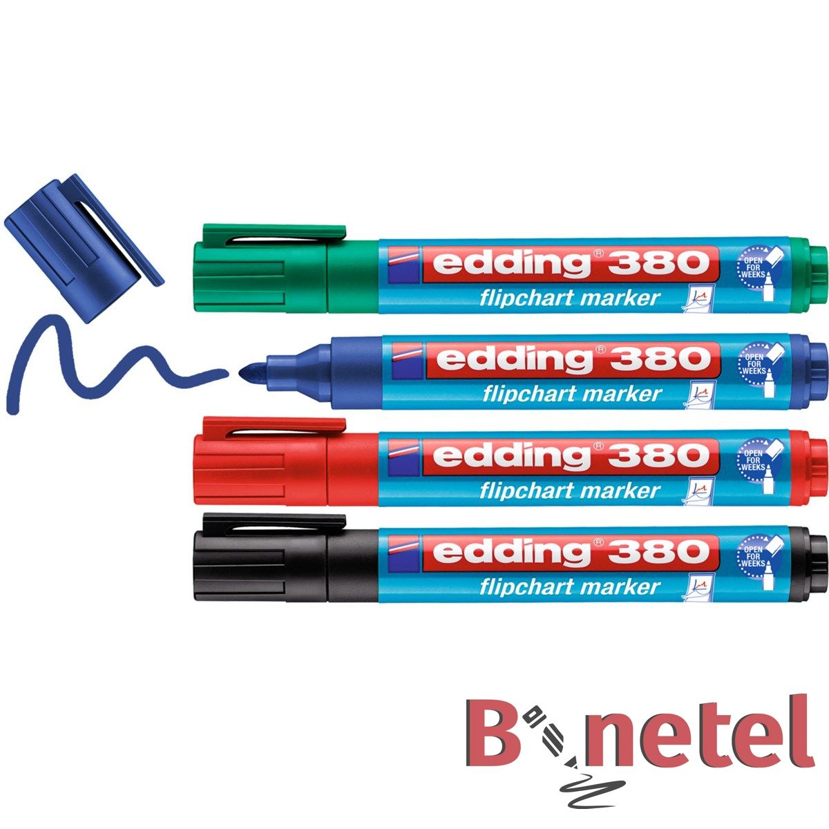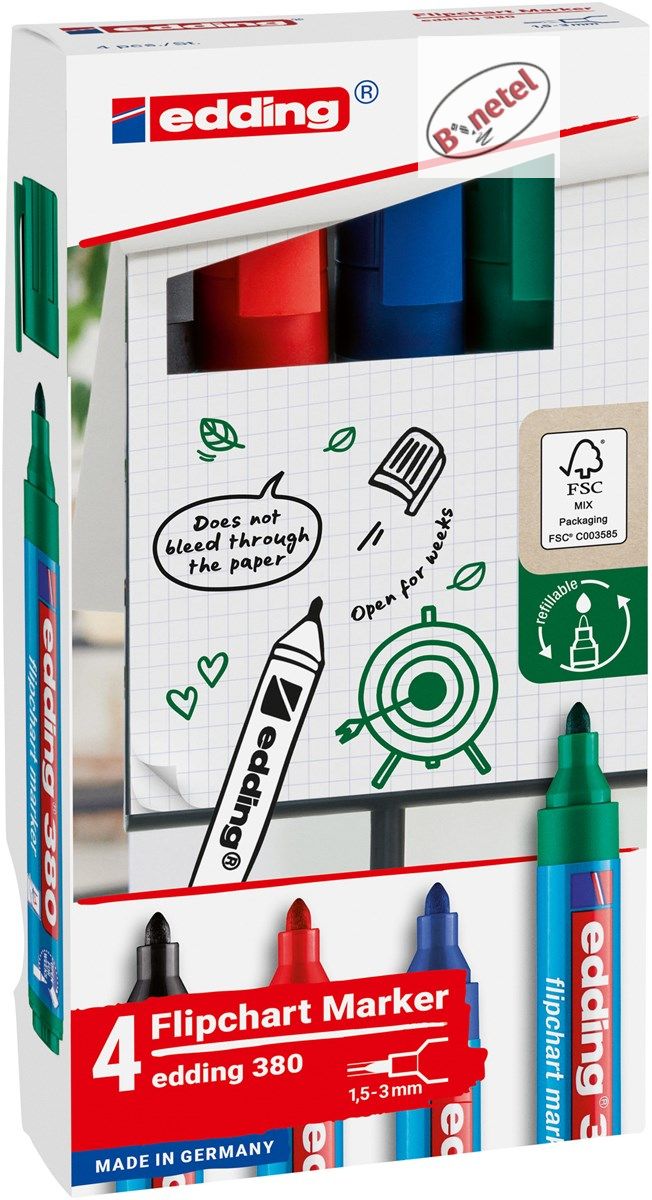 Edding 380 flipchart markeri su nezaobilazan alat za svakoga ko redovno drži prezentacije ili moderira sastanke. Ovi markeri nude jasne boje koje se posebno dobro ističu na flipchart papiru. Njihovo mastilo je posebno formulisano da spreči probijanje. Okrugli vrh obezbedjuje konzistentnu širinu linije od 1,5-3mm.
