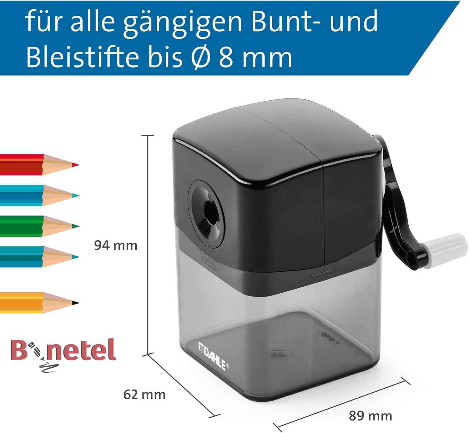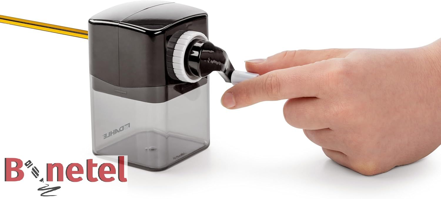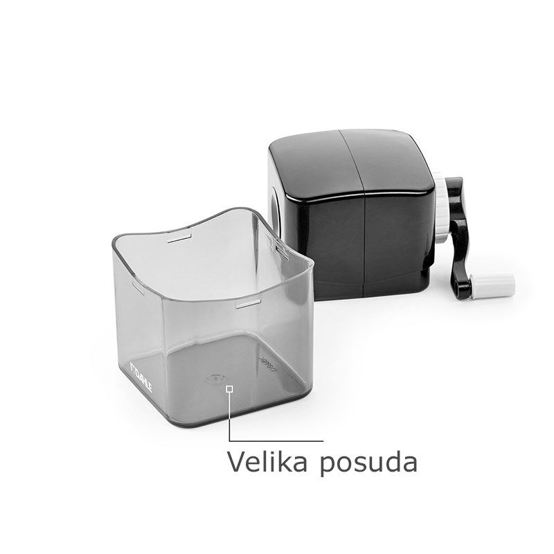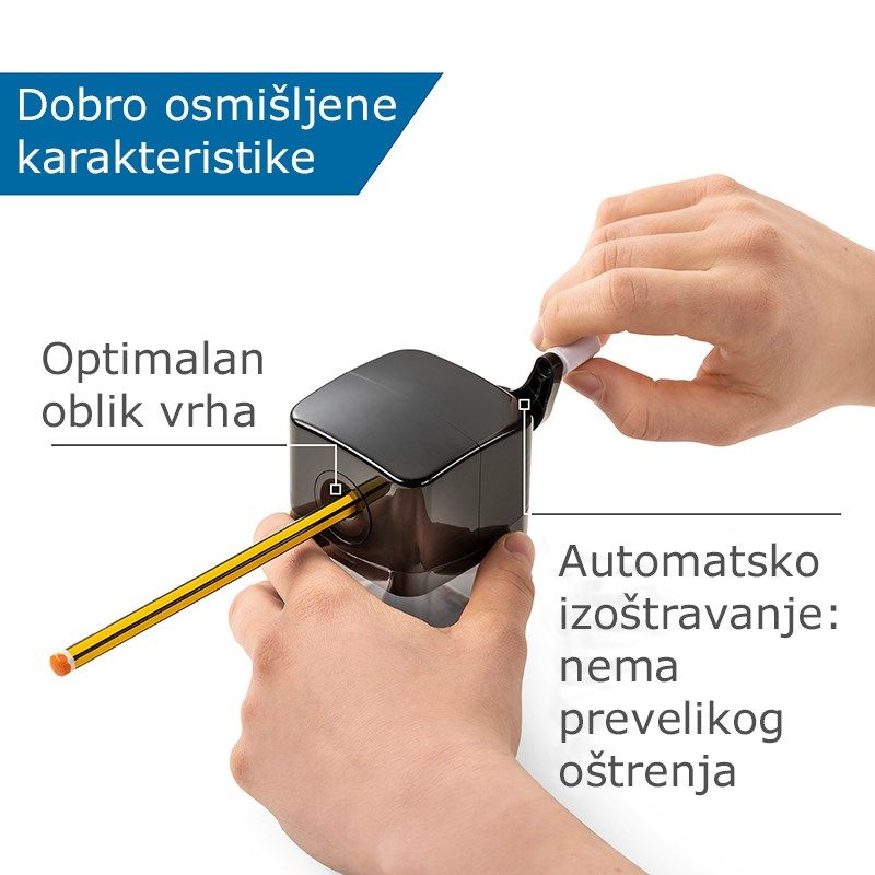 Zarezač sa kurblom. Mehanizam kurble fiksira olovku na mestu kada se ubaci u rezač - nema potrebe da je okrećete, vučete ili stežete.